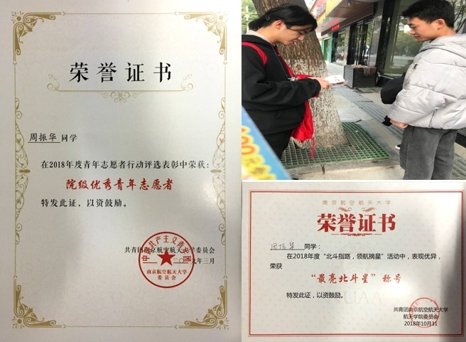 周振华,男,汉族,1999年10月生人,共青团员,航天学院空间科学与技术专业2017级学生。获年度特别嘉奖精英奖、国家奖学金、优秀生奖学金一等奖。曾作为队长获第十届中国大学生物理学术竞赛团体一等奖、个人奖“最佳反方奖”;参演南航首部大型原创话剧《中国直升机泰斗王适存》;带领暑期社会实践团队团队获人民网社会实践“千校千项”成果遴选“百佳创意短视频”荣誉。主持国家级大创1项,取得计算机软件著作权1项。获三好学生、优秀青年志愿者、实践先锋、优秀团员等荣誉称号。科创、文体、学工,他是用自己的方式诠释“全面发展”的新一代南航人。