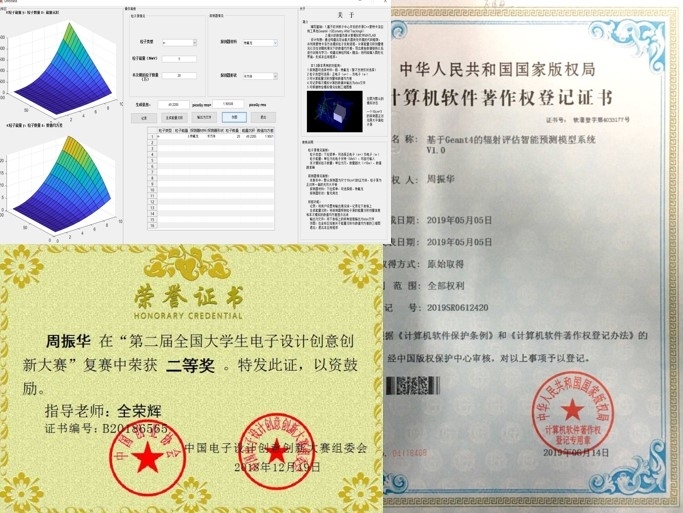 除开竞赛,我还以负责人身份结题一项自由探索项目“基于Geant4的辐射评估人工智能模型”。自学Matlab编写出了一份具有图形交互界面的软件,能根据用户设定数值模拟出航天器在一定材料和几何条件下,受到空间中辐射粒子的能量沉积。该项软件已获授权计算机软件著作权证书,并取得第二届全国大学生电子设计创意创新大赛的二等奖。以负责人身份主持一项国家级大创,目前项目正在进行中。