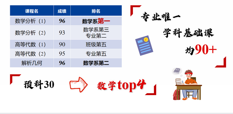 就这样,时间在一个个知识点中流淌,成绩在一道道解析题中提高,功夫不负有心人,在大一第一学期结束时,我的成绩位居全系第二名。过去的一年,我的成绩从预科时的二三十名到如今的专业第4,从高考成绩倒数到全专业唯一所有学科基础课90+,从高考数学成绩刚刚100出头到数学分析专业第一,并获得两次优秀学生奖学金,两次学业奖学金,三好学生等荣誉称号,这一切靠的不仅仅是一份坚持,更是面对挫折时拥有的一份信念。