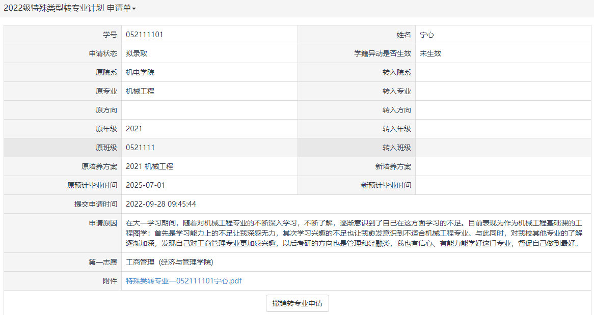 一次偶然的契机,我在学校教务处官网看到了“特殊类型转专业”政策——受到学业严重警示且未达到退学要求的学生或不适合在现专业继续学习并经学院审定认可的学生,可申请特殊类型转专业。这无疑使我看到了希望的曙光,当看到可申请转入的学院里有我一直向往的经管学院时,我几乎是毫不犹豫地向学校提交了转专业申请,并选择了工商管理作为目标转入专业。