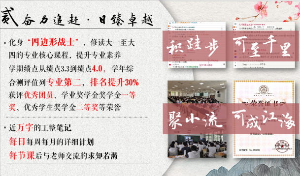 在转入经管学院后,我发现这是一个自由、开放、包容的集体。学院对以我为代表的特殊类型转专业群体给予了高度的重视与关怀,为我们开设院长、书记午餐会,配备专项兼职辅导员,安排朋辈帮扶学导,定期组织读书分享会、“边读边跑”团等活动。老师、同学们的关心,让我感受到温暖、找到了归属感,我也开始探索从“工科”到“文科”的更好转变,结合经济与管理人才培养目标,寻找真正适合自己的发展道路。这一年,我细致安排每天计划,积极与老师交流,整理出几万字的工整笔记。日日夜夜地辛苦付出,使我的成绩直线提升——学期绩点从3.3提升至4.0,年度综合测评中位列专业第二,获优秀学生奖学金,斩获全国大学生英语竞赛三等奖等10余项荣誉,实现了学业上的逆风翻盘。