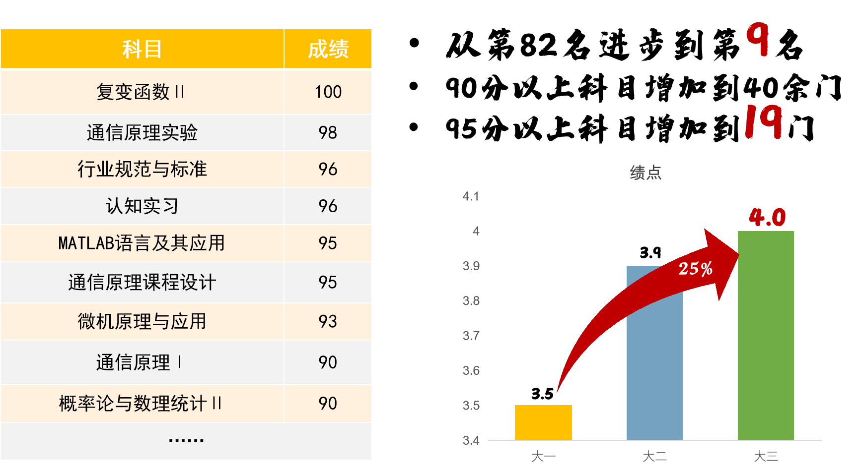 课堂上,我不再怯懦,教室第一排永远有我的身影。课后,我也不再固步自封,向身边的优秀同学请教,改变学习方法,他山之石,可以攻玉。我及时复习整理课堂知识,积极和老师讨论不懂的专业难题。经过不断调整,我终于“开窍”,抓住了专业课的知识脉络,搭建起了知识框架。在那之后,我的成绩稳步上升,大三学年必修绩点位于专业前5%,从大一的年级第82名进步到大三的专业第9名,90分以上科目增加到40余门,95分以上科目增加到19门。