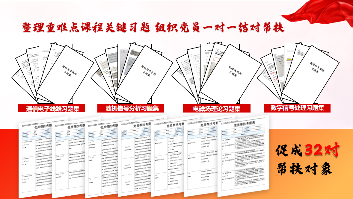 我加入到年级中心组学习部,围绕“通信电子线路”、“随机信号分析”等高难度专业课程,整理关键习题,组织党员一对一帮扶32名学业困难的同学。